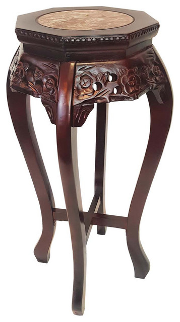 Furniture & Modern Design . 386 . Carved Asian Plant Stand . 35 ½" x 14" . Carved wood plant stand with cabriole legs, reticulated aprons, and marble inset top; bamboo leaf motif throughout .