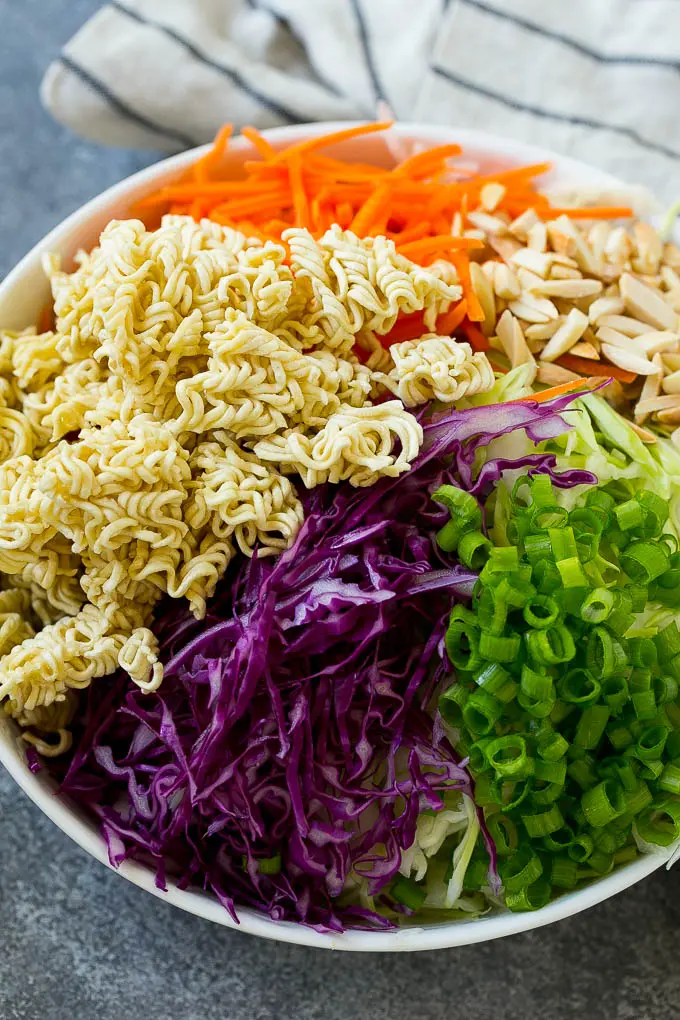 Along with the ramen noodles, this Chinese chicken salad is packed with healthy goodies like shredded cabbage, cilantro, green onions, red bell pepper, and chicken . But the chicken is completely optional . If I happen to have leftover chicken, or a rotisserie chicken I'll add it in . If not, the salad is still amazing without it .