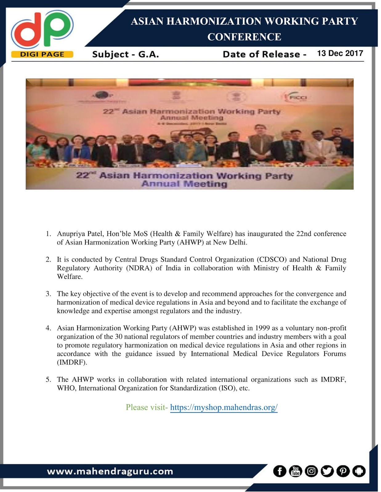 The Asian Harmonization Working Party (AHWP) is established as a non-profit organization . Its goals are to study and recommend ways to harmonize medical device regulations in the Asian and other regions and to work in coordination with the Global Harmonization Task Force, APEC and other related international