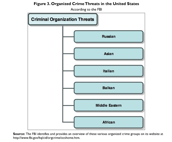Organized crime stretches far beyond the Italian mafia, encompassing Russian, Asian, Balkan, Middle Eastern, and African syndicates . Even though organized crime has not received as much recent media or congressional attention as have other national concerns, such as the threat of terrorism, these criminals have not ceased their illicit activities .