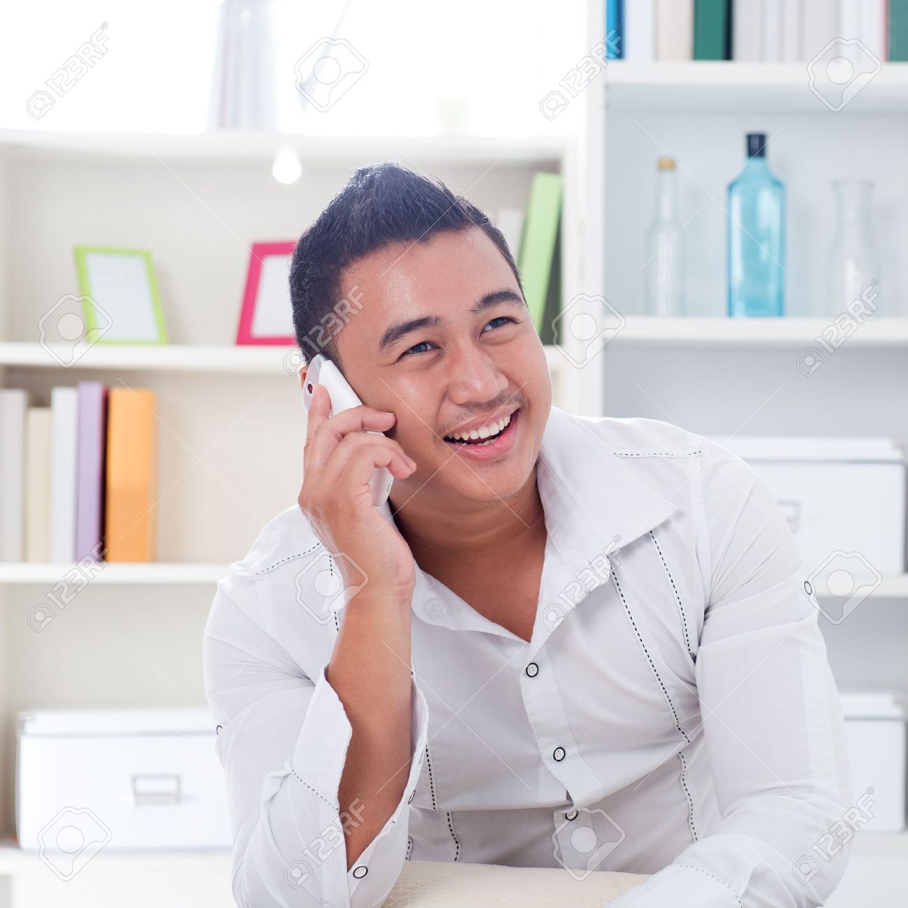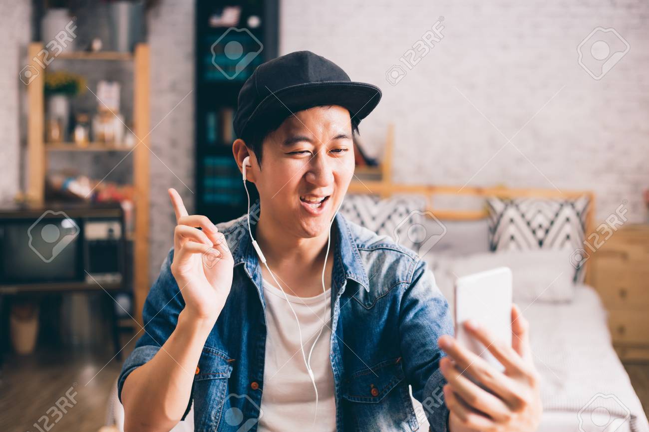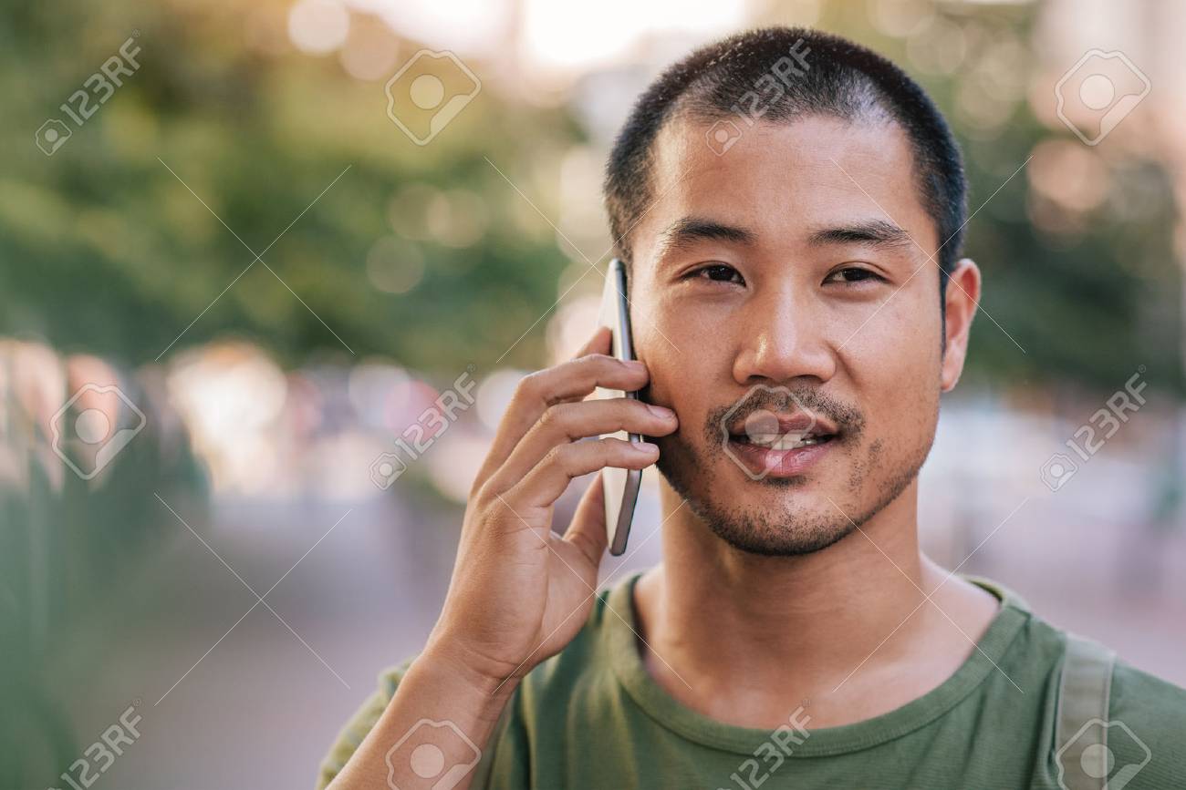 Asian Man Enjoying Conversation Talking And Chatting On . . .