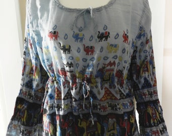 Oversized dropped shoulder blouse, round neck, covered button front . Border print down the front and an elaborate centrally placed print on the back . In a washable soft rayon . Size M measures: Bust 50", Length 26" . Size 1X measures: Bust 59", Length 27" .