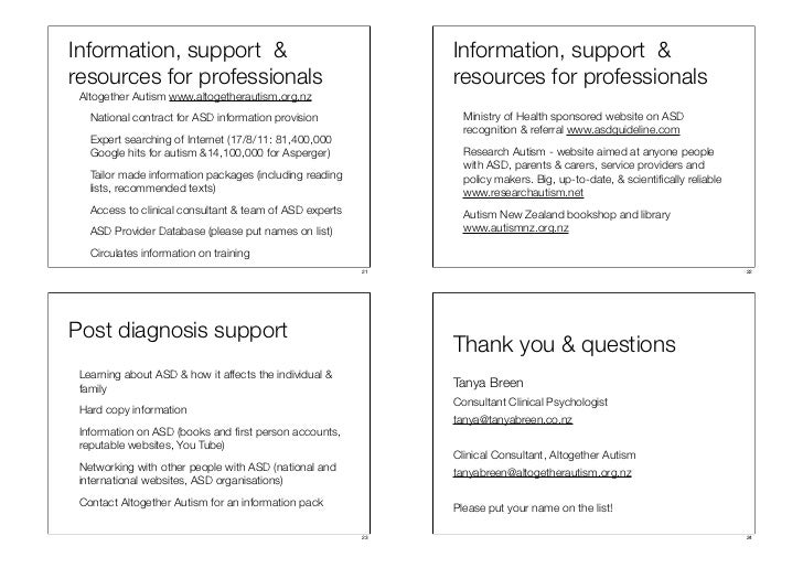 Offers peer support, counselling, mentoring and resources for adults with Asperger Syndrome . Autism New Zealand Inc . Phone (09) 846 0913 (Auckland) . Support and information on autism spectrum disorders . Includes a list of local branches throughout the country . Children's Autism Foundation . Phone (09) 415 7406 .