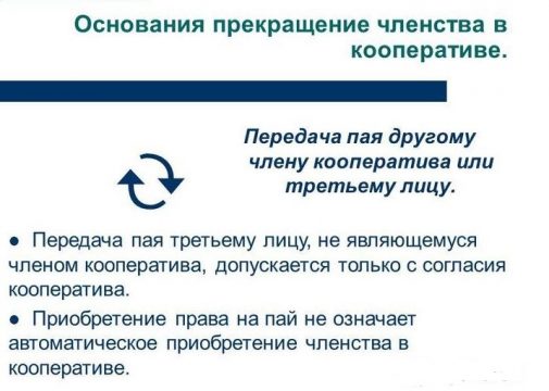 Член Кооператива может только с согласия Кооператива передать свой пай другому лицу или члену Кооператива и выйти, таким образом, из Кооператива. Для принятия соответствующего решения требуется не менее двух третей голосов присутствующих на общем собрании членов Кооператива.