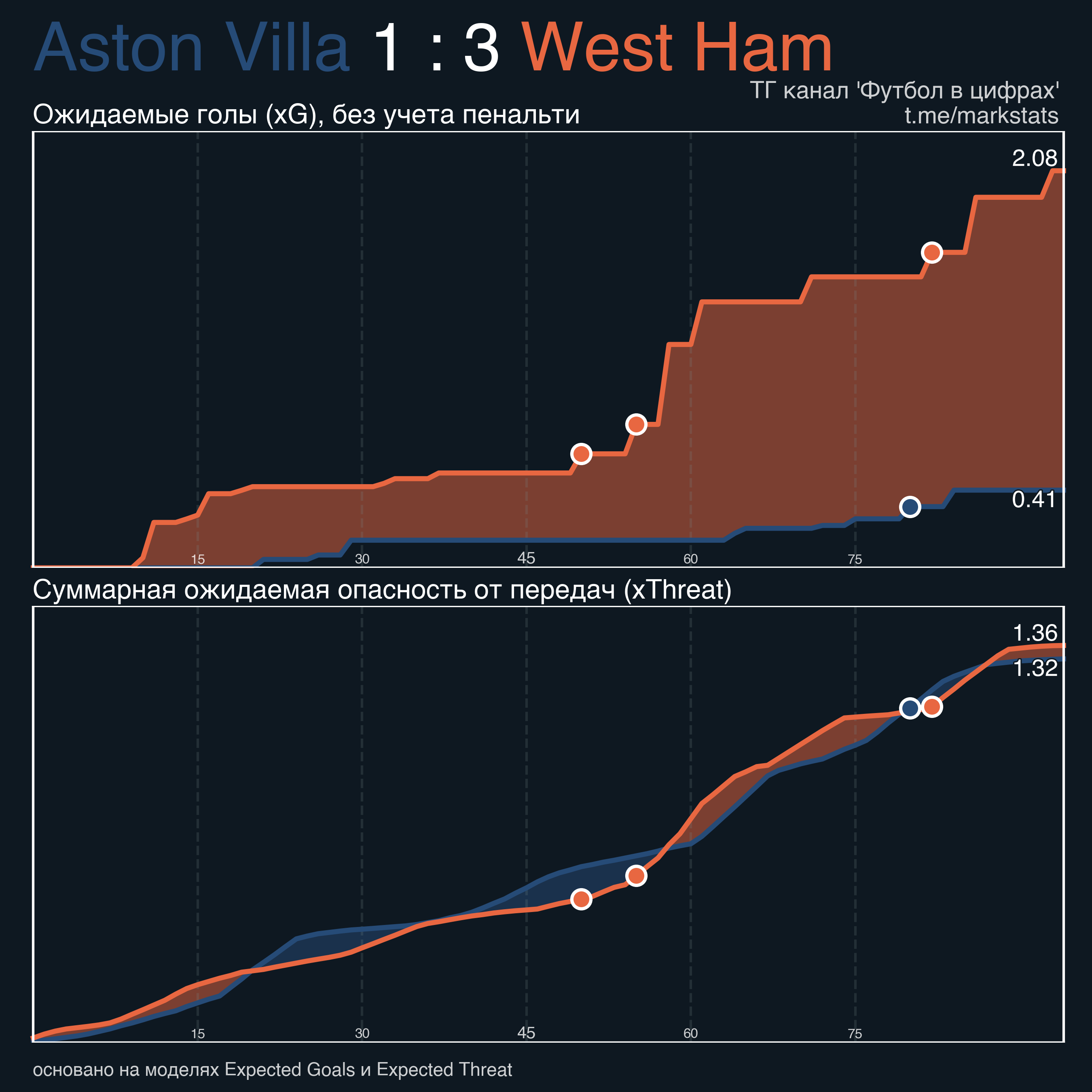 ▪ Ожидаемые голы (NPxG): 0.41 - 2.08