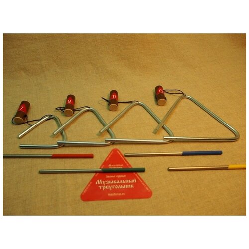 MS-ZH-KT-TR-06 Jeu de triangles n°6, 4 pièces 07-13cm, diamètre 6mm, Atelier SerebrovMS-ZH-KT-TR-06 Jeu de triangles n°6, 4 pièces 07-13 cm, diamètre 6 mm, Atelier Serebrov Cet ensemble de triangles est représenté par 4 triangles : 07-09-11-13 cm, ayant un diamètre de 6 mm Dans l'atelier de Serebrov, une technologie spéciale de traitement thermique du métal avec refroidissement ultérieur a été développée expérimentalement. Le résultat est un instrument de musique au timbre excellent, au son noble et mélodieux (jusqu'à 20 secondes). Tous les instruments sont équipés d'un bâton de percussion en acier inoxydable et d'une suspension originale. Le revêtement galvanique ne dégrade pas la qualité sonore et n'est pas détruit par les contraintes mécaniques. 4 triangles : 7, 9, 11, 13. Matériau : acier Diamètre : 6 mm 4 cintres, 4 bâtons.