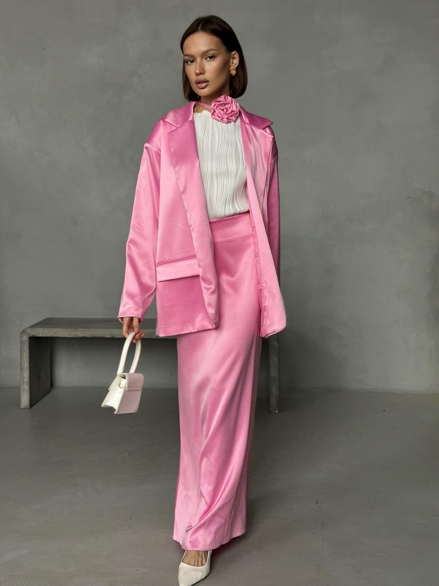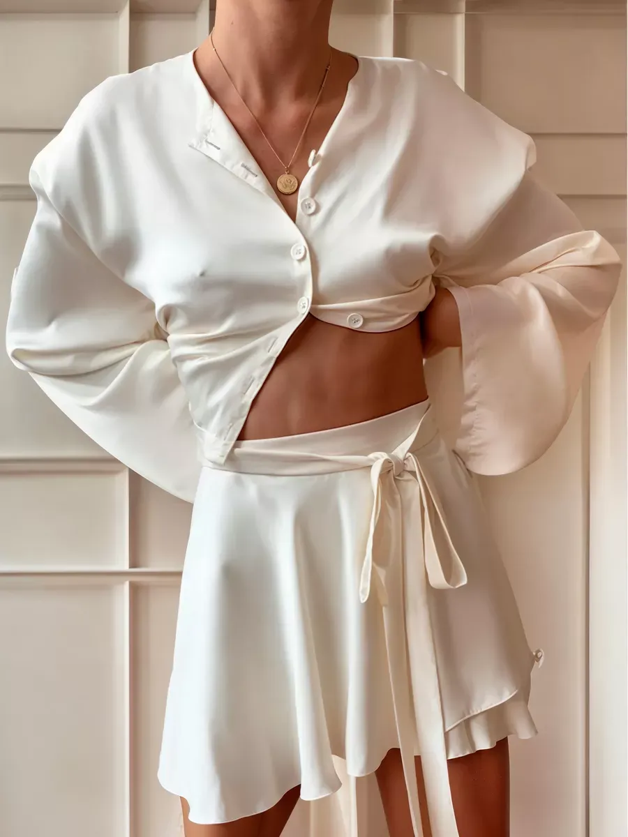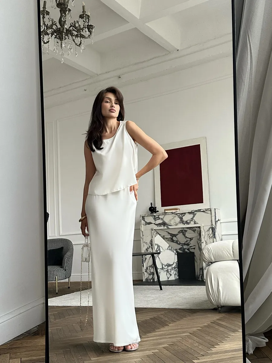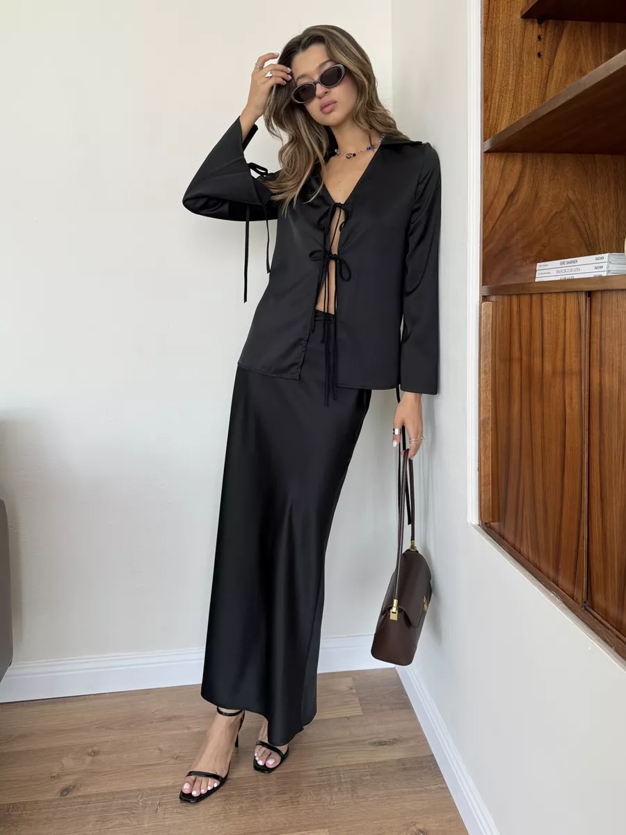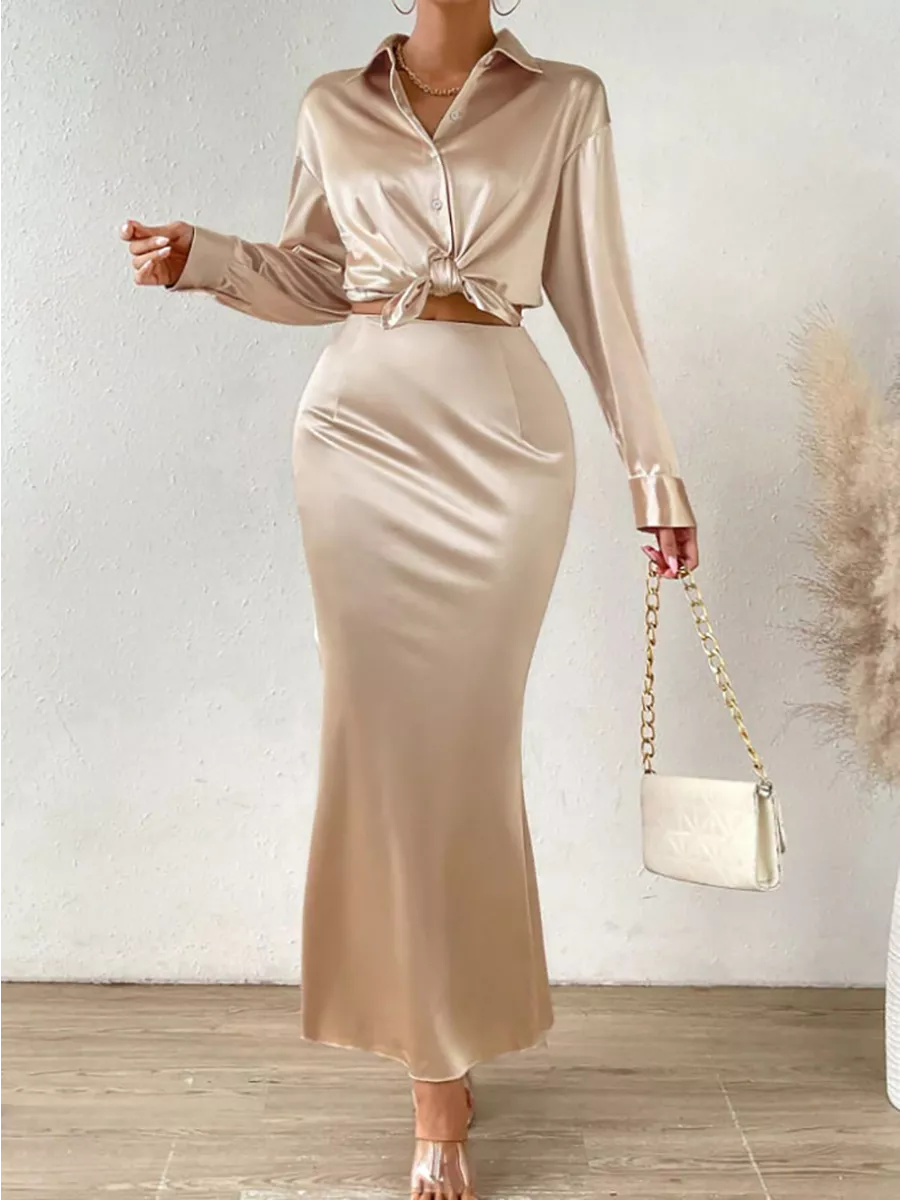 Атласный костюм с юбкой 90 фотографий