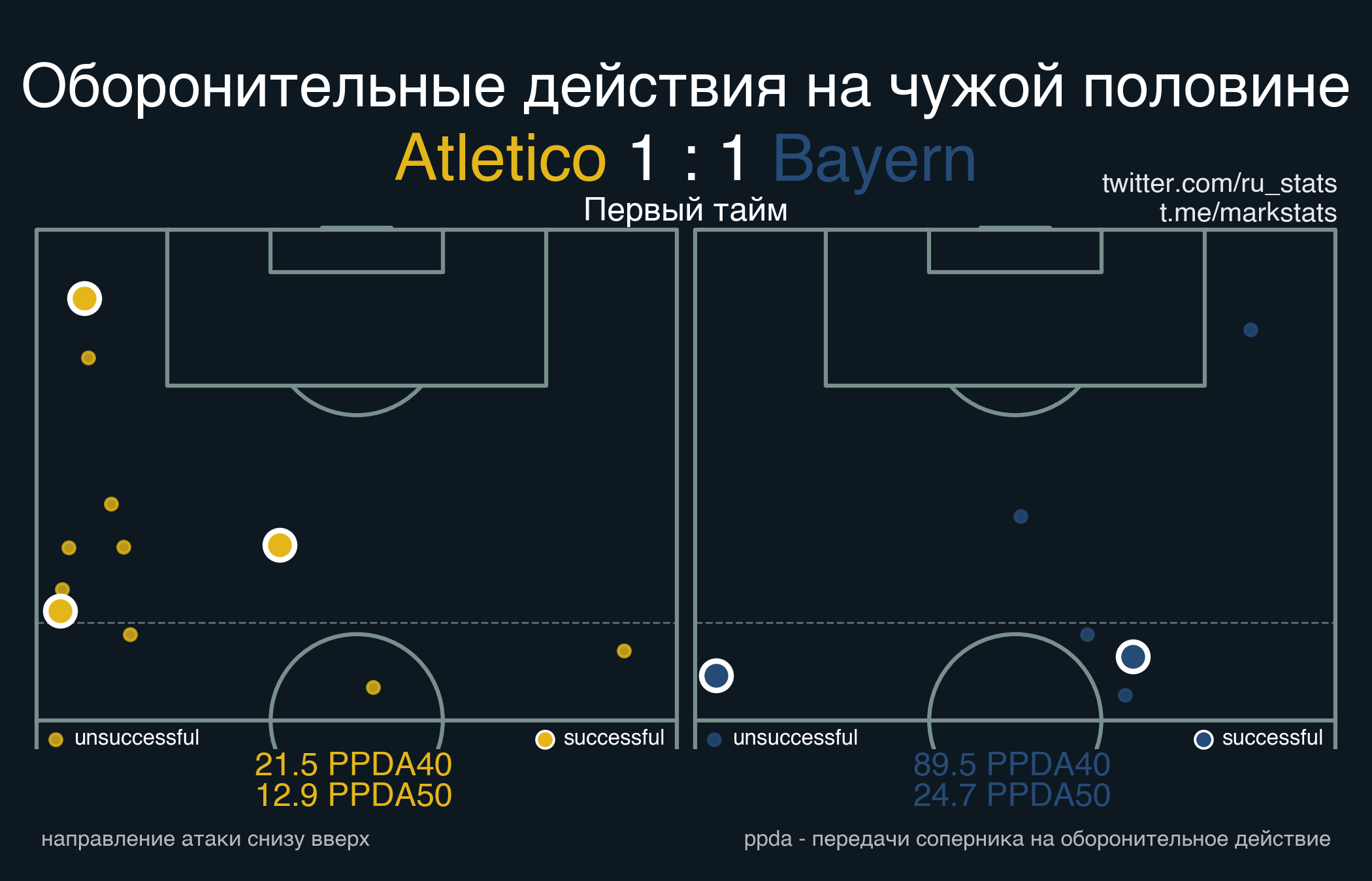 Дубль Баварии прессингует гораздо менее интенсивно, чем основа. Всего 6 прессинг действий на половине Атлетико в первом тайме.