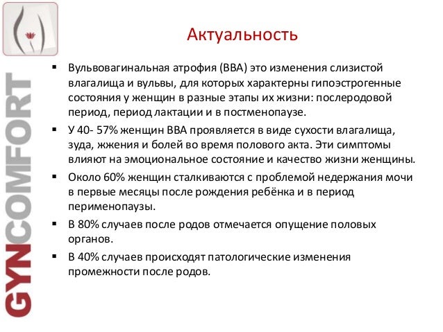 Вагинальная атрофия (атрофический вагинит) — это истончение, высыхание и воспаление стенок влагалища из-за того Вагинальная атрофия возникает чаще всего после менопаузы .