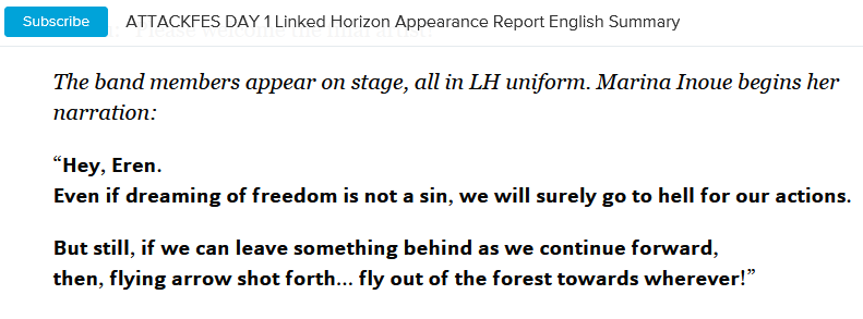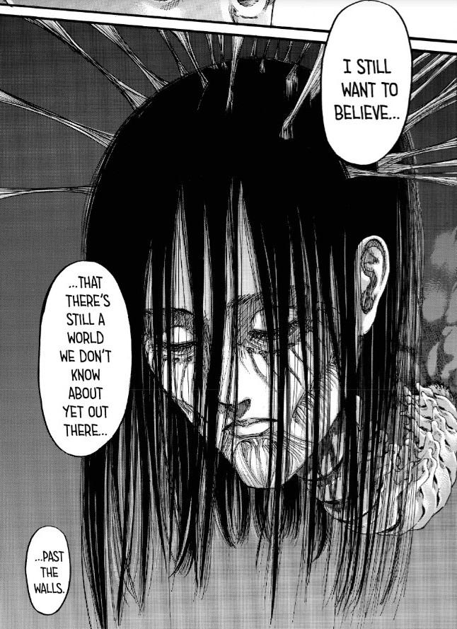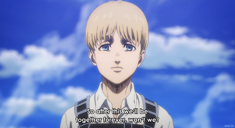 آرمین : "هی ارن. حتی اگر آزادی که آرزویش را داشتیم پاک و بیگناه باشد، ما به خاطر اعمالمان به جهنم خواهیم رفت. اما اگر در مسیر پیشروی مان چیزی از ما باقی بماند، تیری که شلیک شده از میان جنگل خواهد گذشت و پرواز خواهد کرد."