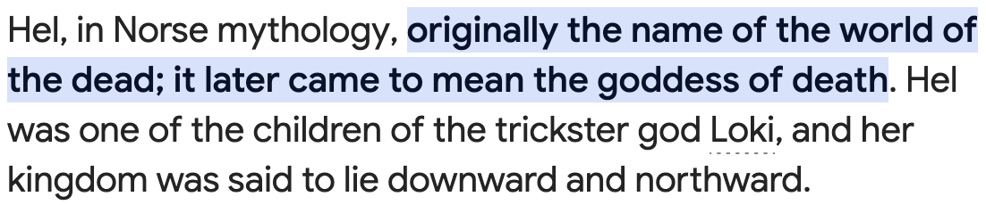 در اساطیر نوردیک، نام «Hel» در ابتدا به دنیای مردگان اشاره داشت و بعدها به معنی الهه مرگ شد. «Hel» یکی از فرزندان خداوند فریبکار لوکی بود و قلمرو او گفته میشد که به سمت پایین و شمال قرار دارد.