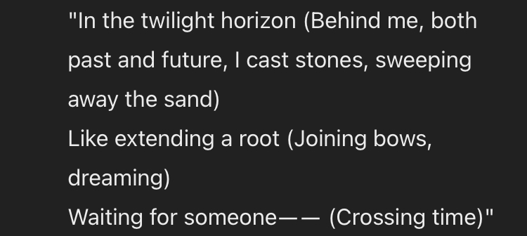 "در افق غروب (پشت سرم، هم گذشته و هم آینده، سنگها رو پرت میکنم و شنها رو میزنم کنار)