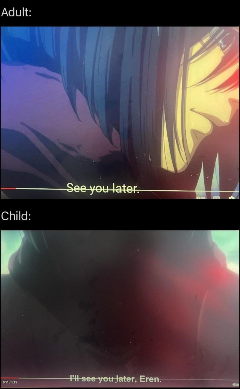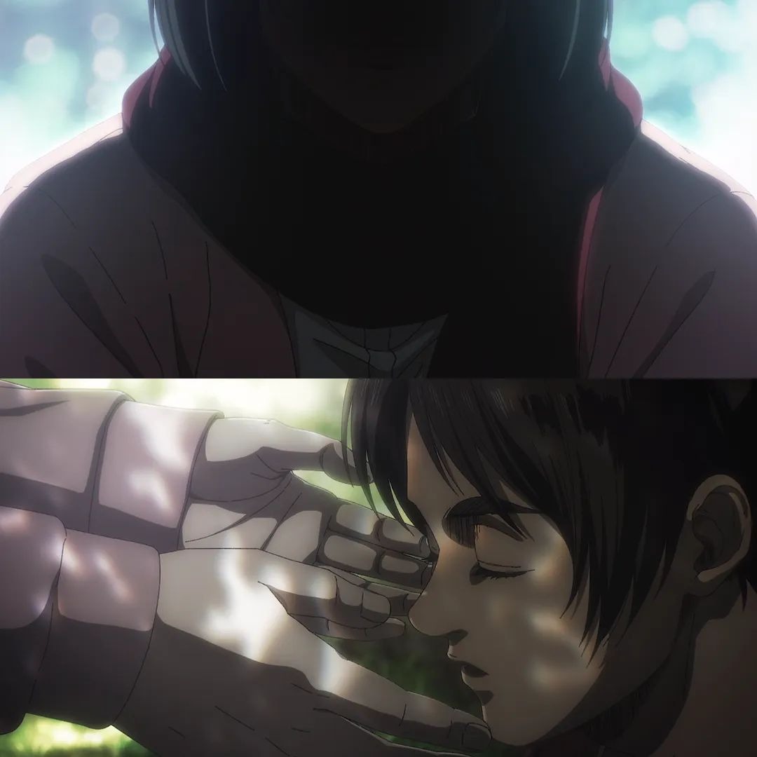 در این سکانس میکاسا سر ارن رو در حال مرگ در تایم لاین اول گرفته، بعدش می بینیم که دستان میکاسا ارن رو به همان شکل گرفته، اما این ارن کودکه.