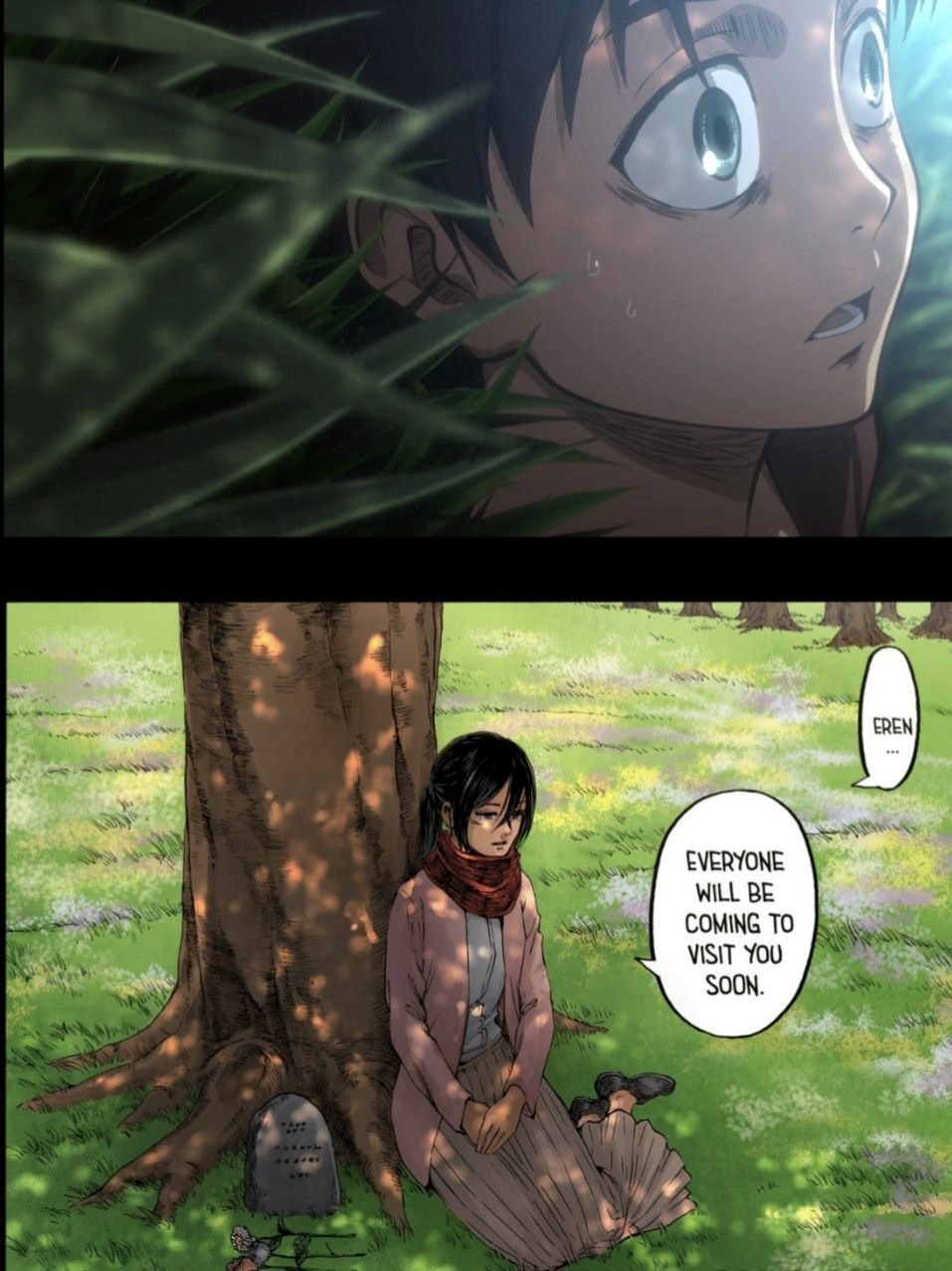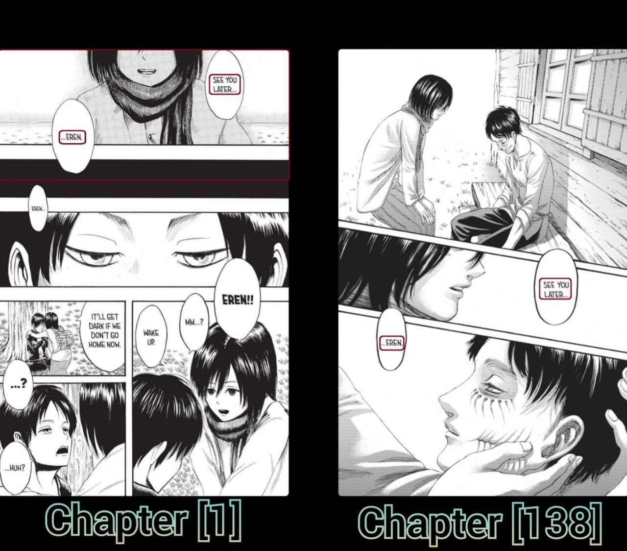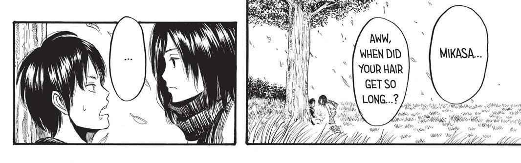 ارن با آرامش در مانگا از خواب بیدار می شه ، نشسته و از میکاسا می پرسه "موهای تو کی انقدر بلند شد...؟"