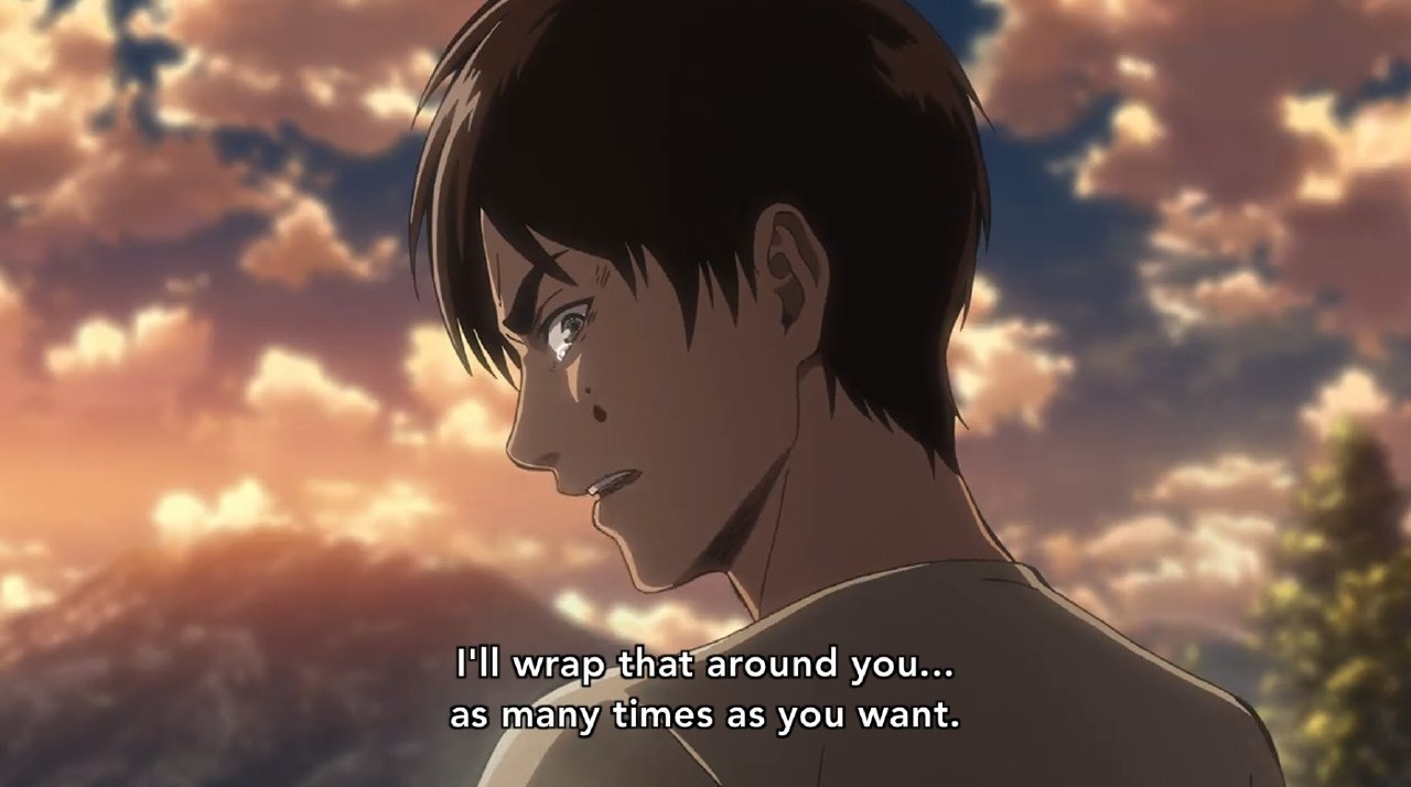 در اینجا میکاسا این انتخاب رو داشت عهدی که ارن باهاش بسته بود رو رها کنه، اینجا مشخصه ارن وقتی به میکاسا میگه شالش رو بندازه دور اشاره به اون عهدی داره که ارن میگه : "هر چقدر میخوای شالو برات میپیچونم تا ابد" ارن قول داده بود همیشه انجام میده . اما جواب میکاسا چی بود ؟ نه متاسفم نمیتونم