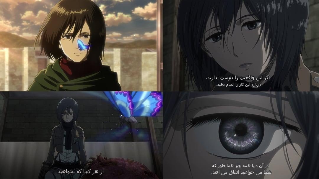 تو زمان 1:20 به بعد یه بازم سکانس نشون میده که میکاسا میگه : "بعدا میبینمت ارن" اما زمانی گفته میشه که ارن تو اون سکانس خوابیده زاویه دید ارن به سمتیه که درخت بالا سرشه به عبارتی انتقال تایم لاین ۲ به ۳ اتفاق افتاده میکاسا کی این عبارت بعدا میبینمت ارن رو میگه ؟ موقع مرگش موقعی که سرش جدا میشه