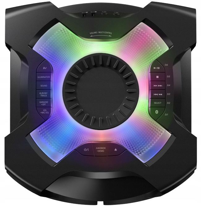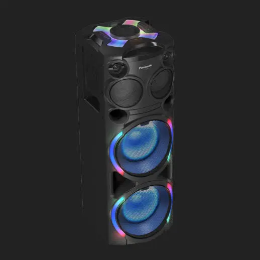 Explore the Panasonic SC -TMAX20 - Mini Systems - 300W (RMS 30%) output with a 20 cm woofer with dual drive and two 6 cm tweeters, plus AIRQUAKE BASS for even deeper bass . Multicolor Illumination produces colorful light to enhance the powerful sound . One-box compact body equipped with built-in battery*, giving you greater freedom to set a party anywhere .