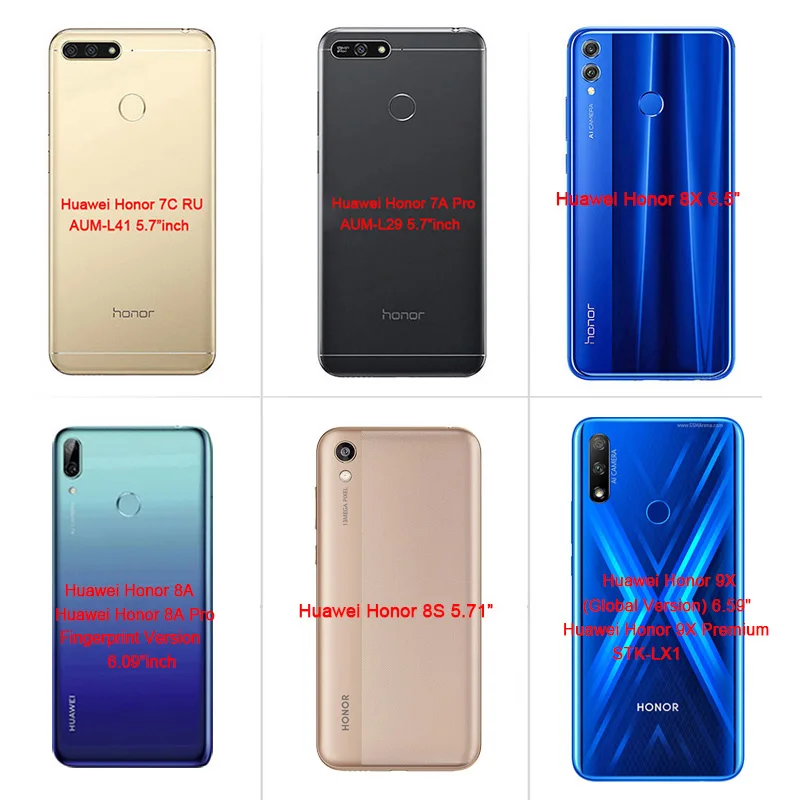 Huawei Honor 10 Lite (HRY- LX1 ) Huawei Honor 20 (YAL-L21) Huawei Honor 20 Lite/Honor 10i (HRY-LX1T) Huawei Honor 20 Pro (YAL-L41) Huawei Honor 3X (G750-T00) Huawei Honor 4A; Huawei Honor 4C; . . . ( AUM -AL00) Huawei Honor 7C (LND-AL30) Huawei Honor 7i ShotX (ATH-U01) Huawei Honor 7X (BND-L21) Huawei Honor 8; Huawei Honor 8 Pro; Huawei Honor 8A (JAT . . .