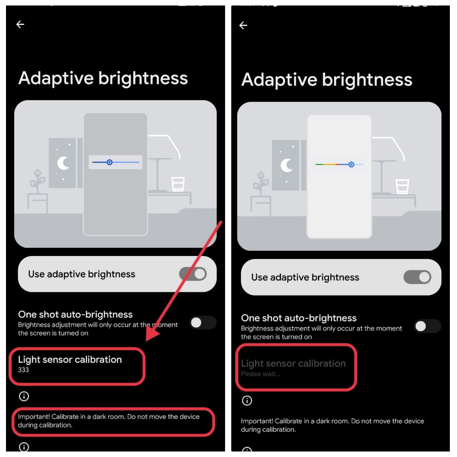 Make Sure you're in a Dark environment as the warning says and then click on Light Sensor Calibration, it'll say Please wait and adjust the value.