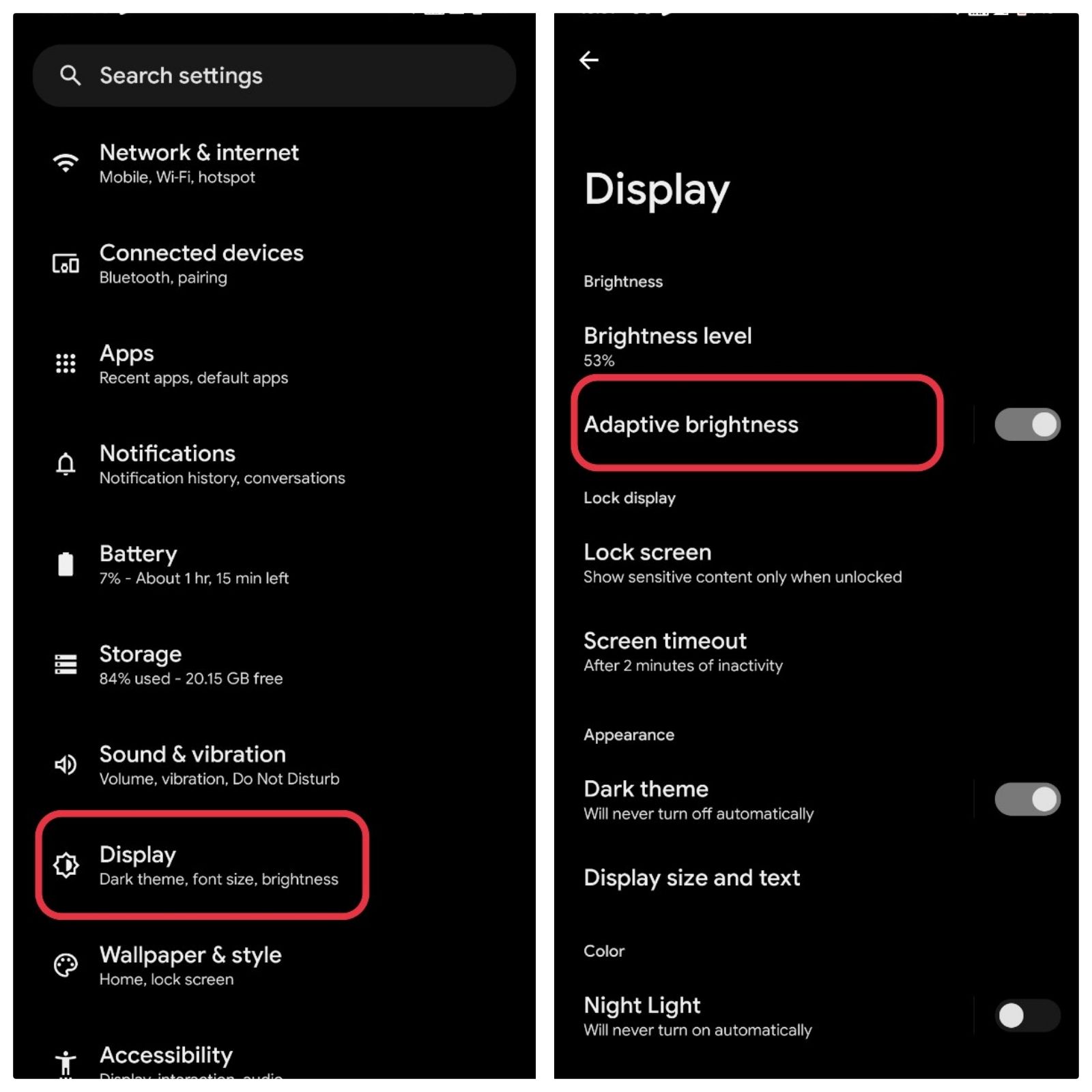 Go into Settings, Click on Display and then Tap on Adaptive Brightness