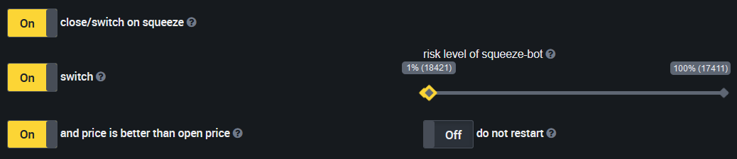 Settings: You can adjust the sensitivity of the squeeze bot (at 100% sensitivity, it will close at a stronger pump or (if it is a short bot) a strong dump).