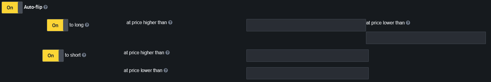 If you don't want to enter prices manually, you can enable the automatic options "Flip to short in case of a pump" (for a long bot) and "Flip to long in case of a squeeze" (for a short bot). It is located at the bottom of the "Stop Loss" section. In this case, you do not need to enable the "Auto Flip" algorithm.