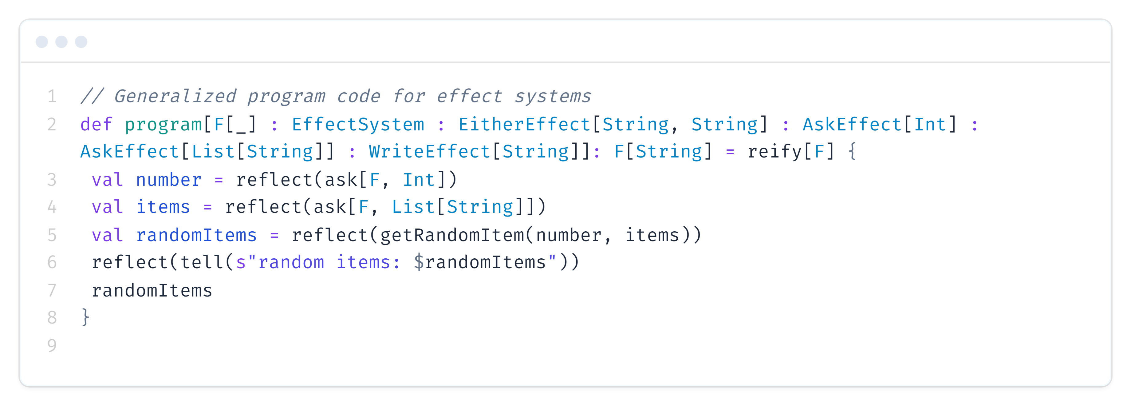 At this point, It is possible to write programs using effects in a direct style. Also, we can abstract out from the technical details of each effect system and use EffectSystem typeclass. Here is an example of a program, use generic effect notation.