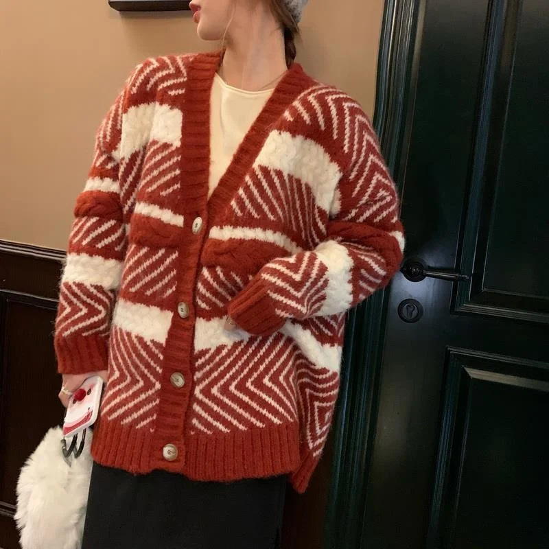 «Autumn 2022 New Loose Lazy Collar Cardigan Long-sleeved Jacket Women Temperament All-match New Year Red Striped Knitted Sweater» по лучшей цене на рынке! Всего за 13$ (1235рублей)