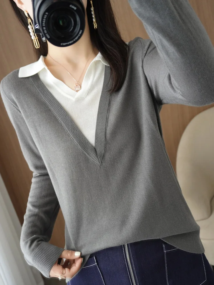 «Autumn And Winter New Fake Two-Piece Cashmere Sweater Women's V-Neck Korean Style Colorblock Knitted Pullover Sweater» по лучшей цене на рынке! Всего за 23$ (2185рублей)