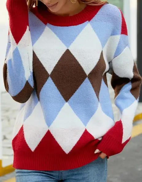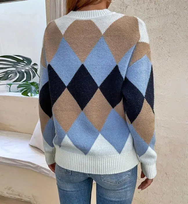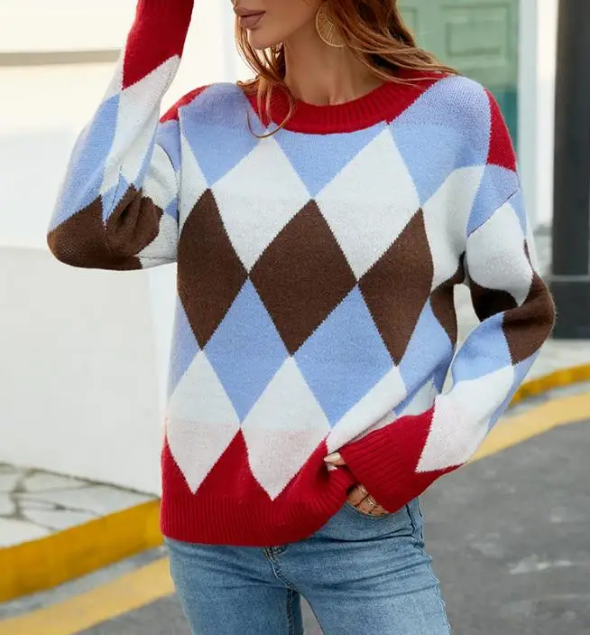 OXTrlLPeHere you can buy Autumn Winter New Contrast Diamond Cross border Sweater with Diamond Pattern Design Long Sleeve Pullover for Fresh Sweet Style with free delivery to your post office.