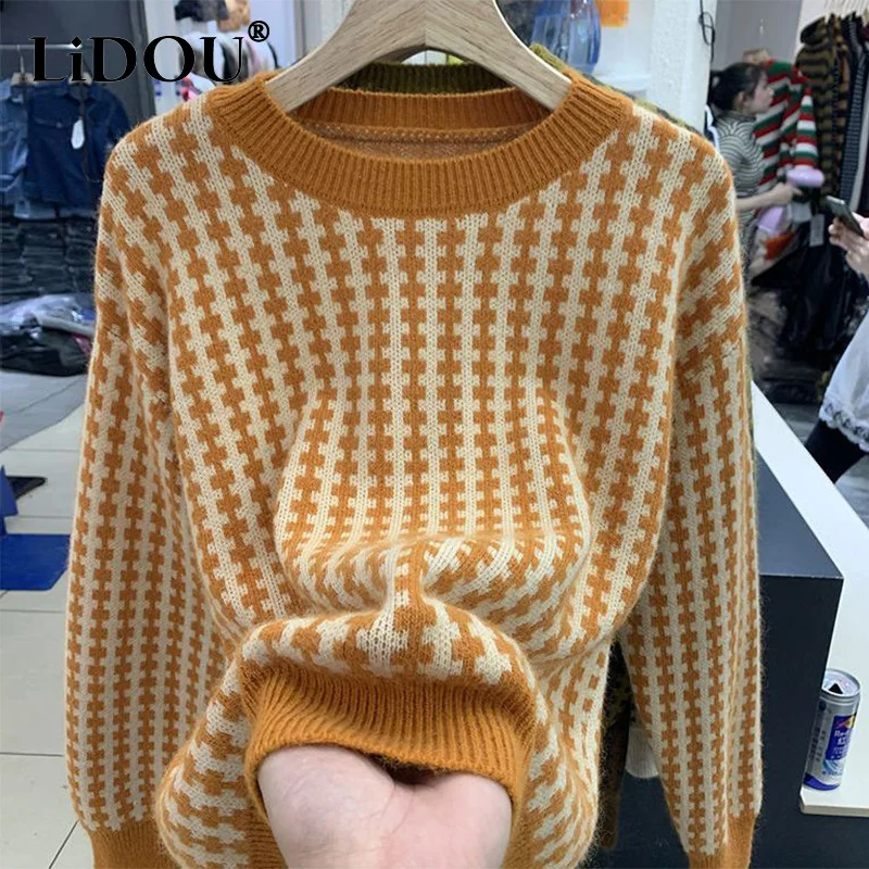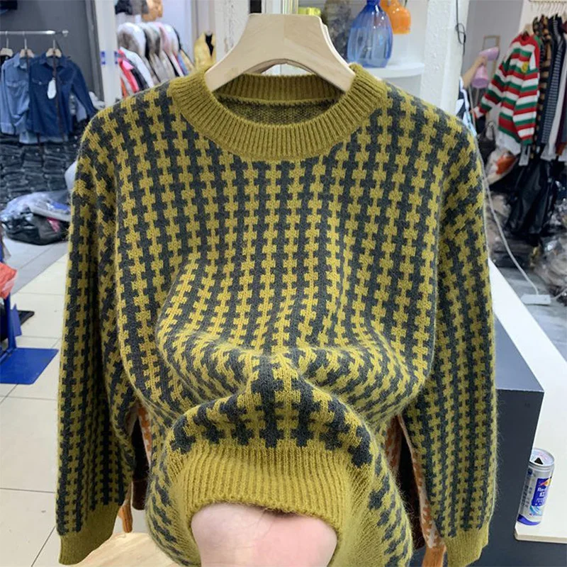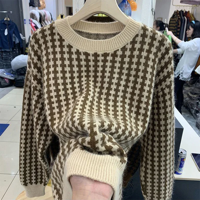 «Autumn Winter Round Neck Vintage Plaid Print Sweater Ladies Loose Casual All-match Bottoming Kniting Pullover Tops Women Jumper» по лучшей цене на рынке! Всего за 19$ (1805рублей)