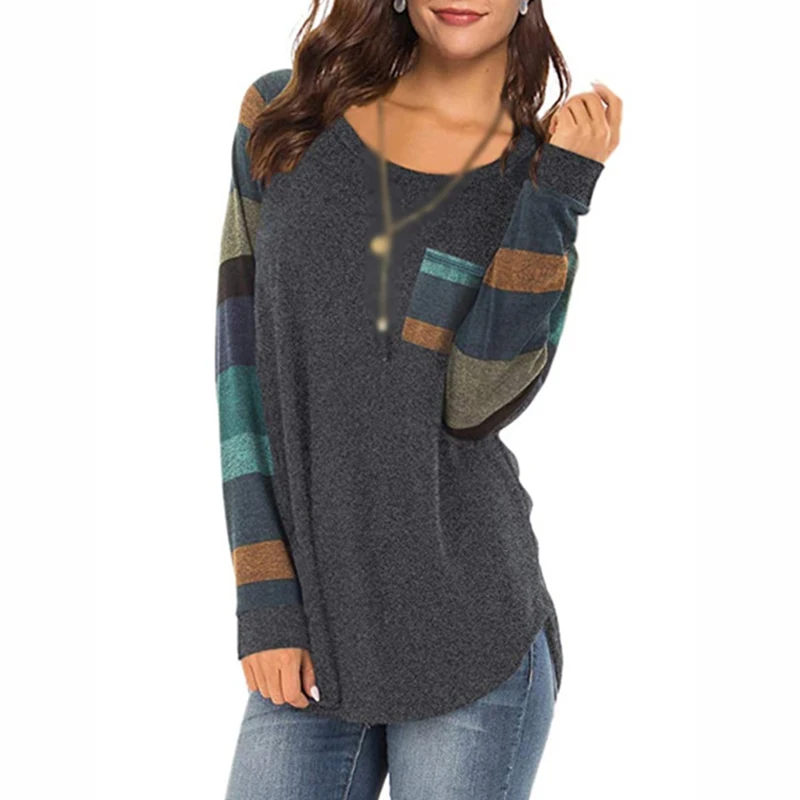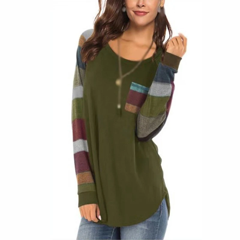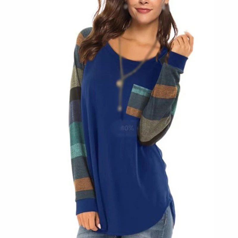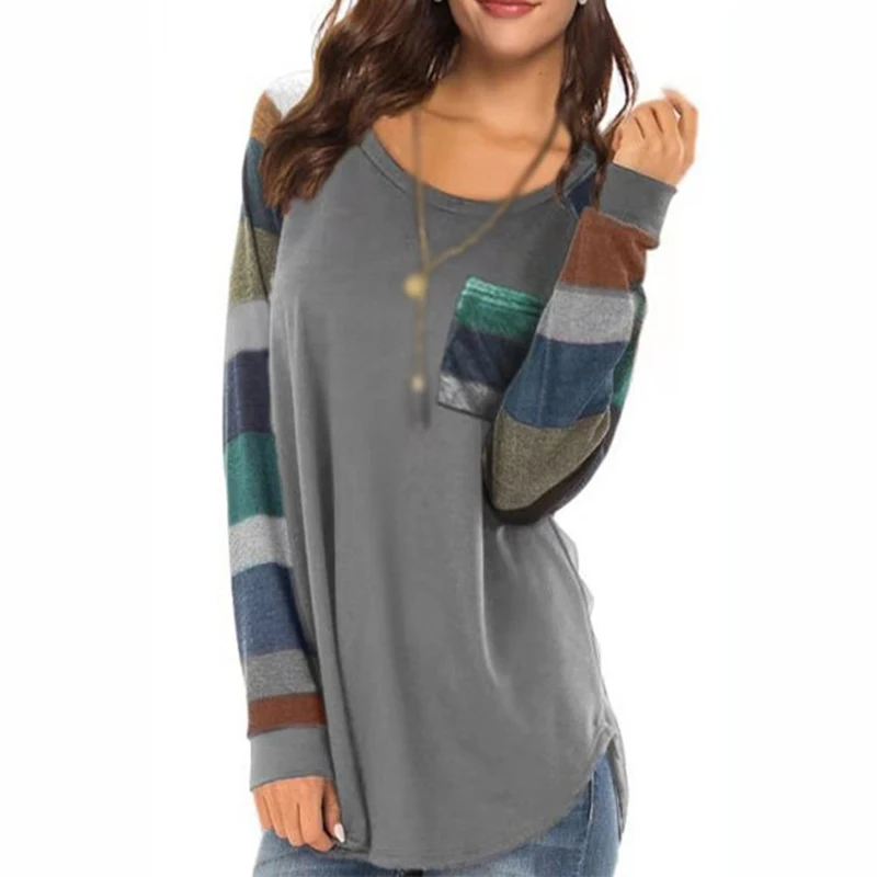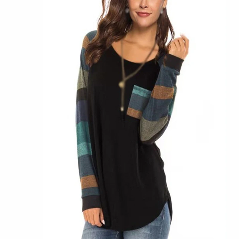 «Autumn Women T-Shirts Casual Striped Color Block Long Sleeve round Neck Front Pocket Blouses Basic Tunic Tops Pullover» по лучшей цене на рынке! Всего за 11$ (1045рублей)
