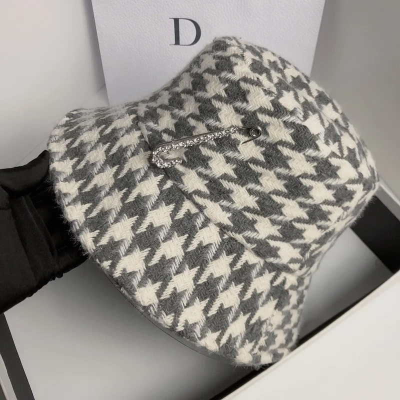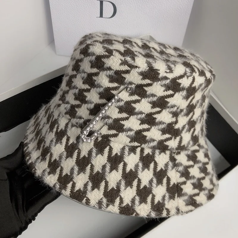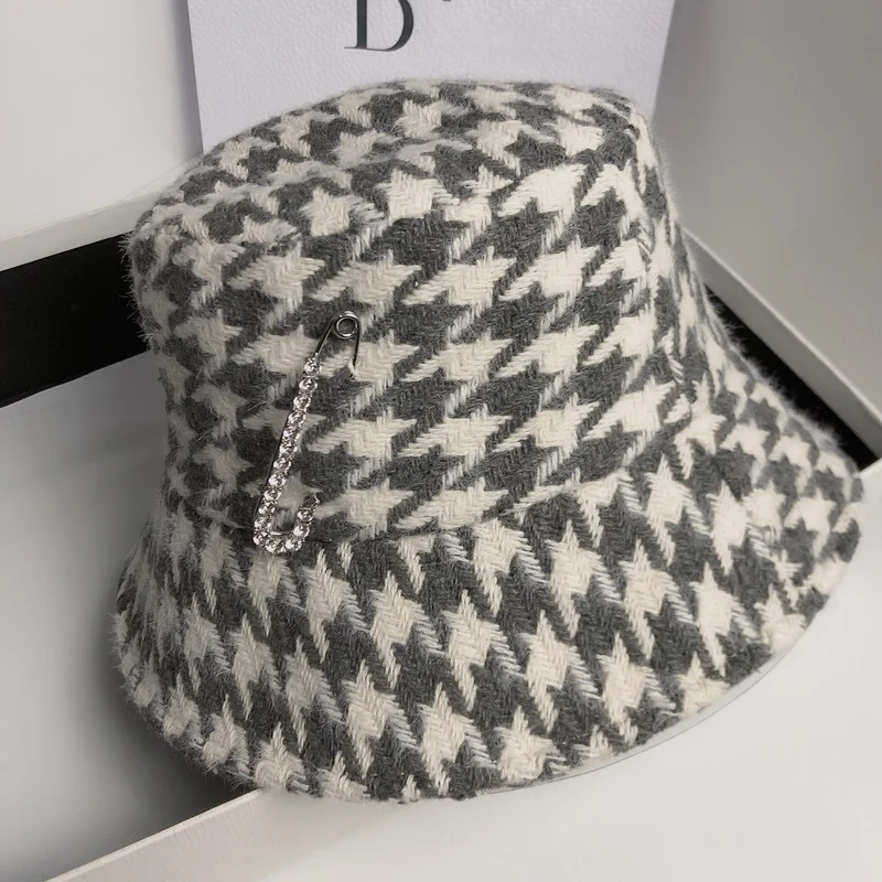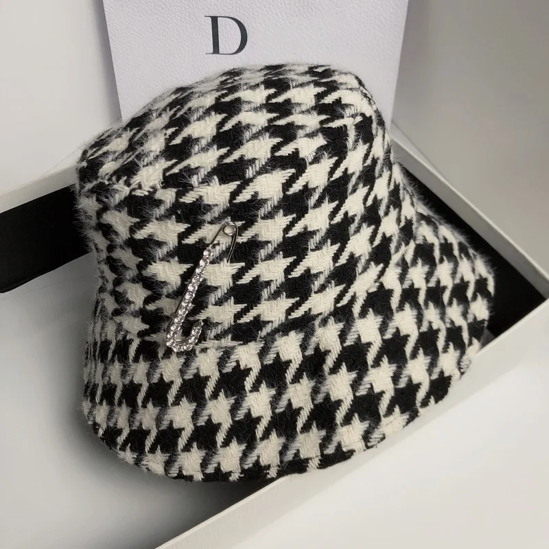 «Autumn and Winter Double Layer Woolen Fisherman Hat Korean Retro Houndstooth Basin Hat Big Brand Rhinestone Pin Casual Hat» по лучшей цене на рынке! Всего за 19$ (1805рублей)