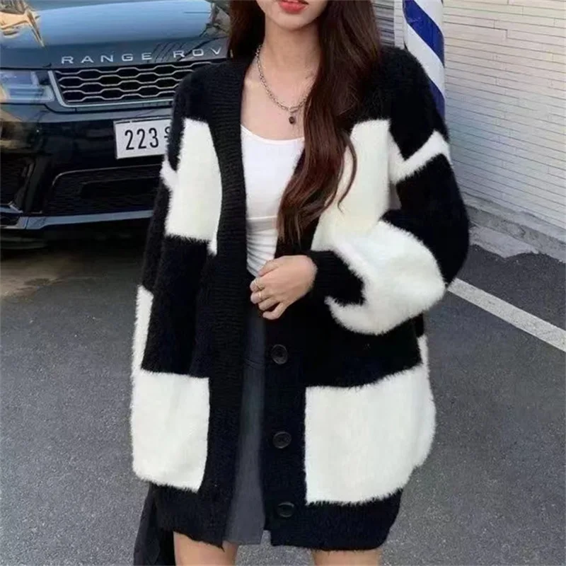 ScqBqkDNIДолго искали Autumn and Winter Imitation Mink Soft Waxy V-neck Loose Knit Cardigan Coat Lazy Wind Black and White Stripe Sweater Women, но не могли найти? Предоставляем вашему вниманию Autumn and Winter Imitation Mink Soft Waxy V-neck Loose Knit Cardigan Coat Lazy Wind Black and White Stripe Sweater Women по лучшей цене на рынке!