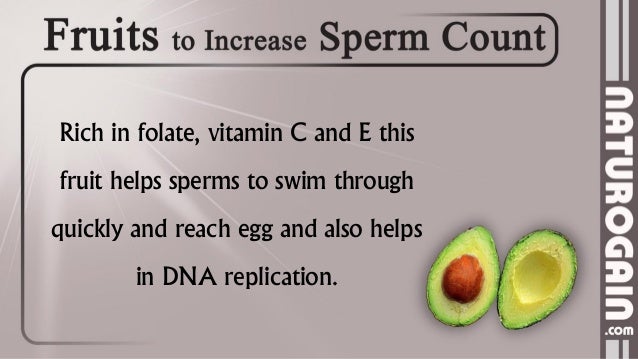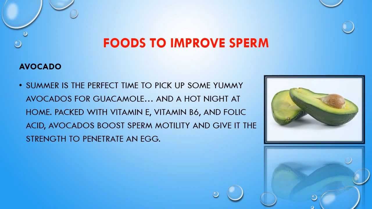 Zinc and avocado . Avocado is a good source of zinc . Zinc is found in large amounts in semen which can help to protect the sperm . Having sufficient zinc will help to increase sperm count and sperm motility - both are important for successful conception . Rich source of vitamin E