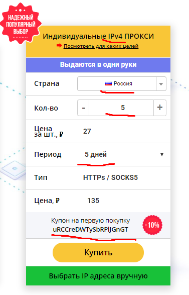 Берем IPv4, остальные не подойдут, выбераем рашку, штучек 5 и не больше 5-ти дней, опасаемся что акк отлететь может.
