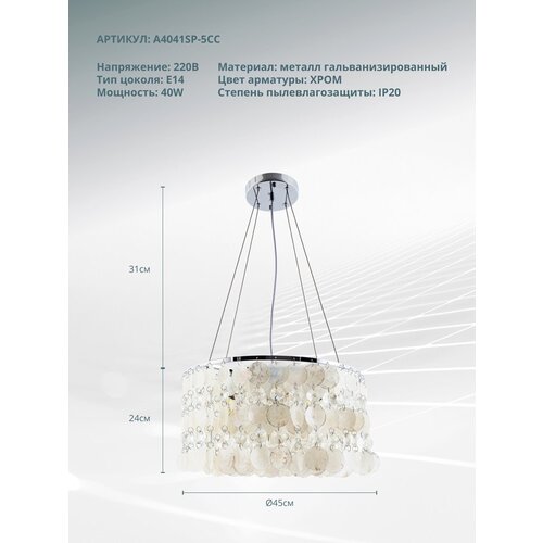 Zincir uzunluğu: 70cm.Avize Arte Lamba A4041SP-5CC PIPIRIMA serisi. Odanın tarzını vurgulayacaktır. Yükseklik 30 cm. Çap 45 cm Toz ve nem koruma parametreleri IP - 20. E14 soketli lamba kullanır. Markanın menşe ülkesi İtalya'dır.