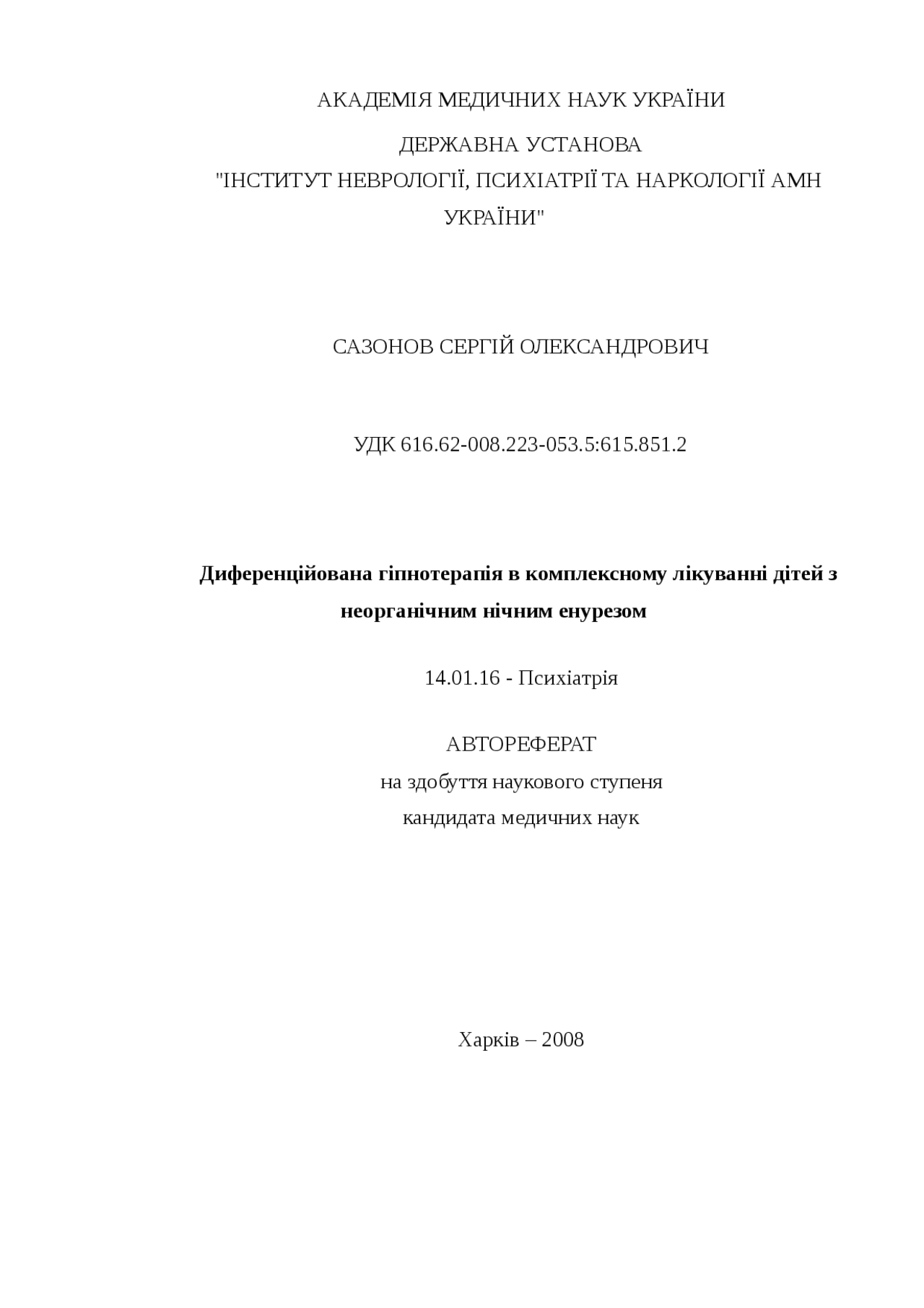 Шифр: 616-053 .2 Авторський знак: С14 Сазонов С .О . Диференційована гіпнотерапія в комплексному лікуванні дітей з неорганічним нічним енурезом . Вид документа: Автореферат Рік видання: 2008 Місце видання: Х . Мова: Українська Обсяг: 20с .