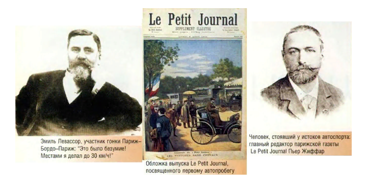 И произнес его главный редактор парижской газеты Le Petit Journal Пьер Жиффар, который 19 декабря 1893 г. опубликовал следующее объявление: «Наша газета решила всеми средствами поддержать новый, революционный способ передвижения человека. В связи с этим Le Petit Journal объявляет конкурс экипажей без лошадей». Что побудило редактора уважаемой газеты, первой в мире достигшей тиража в 1 млн экземпляров, заняться организацией столь необычных и весьма сомнительных с коммерческой точки зрения состязаний - неизвестно. Возможно, это было стремление сделать нечто экстравагантное - такое, чего еще никто не делал и таким образом увековечить свое имя. Не исключено также, что им двигало желание «сотворить сенсацию», а потом написать о ней в своей газете, повысив тираж еще больше. Кроме того, вполне возможно, что в Жиффаре говорил энтузиазм первопроходца. Все это наверняка оказало свое влияние на Жиффара, но современники называют и еще одну причину рождения нового вида спорта - чисто экономическую: «К 1894 г. конструкторы были уже в состоянии строить паровые и бензиновые автомобили. Однако сбыт их был затруднен, публика относилась к ним весьма недоверчиво и не придавала особого значения всему автомобильному делу. Необходимо было поразить ее воображение, чтобы доказать действительную ценность и значение этих новых машин».