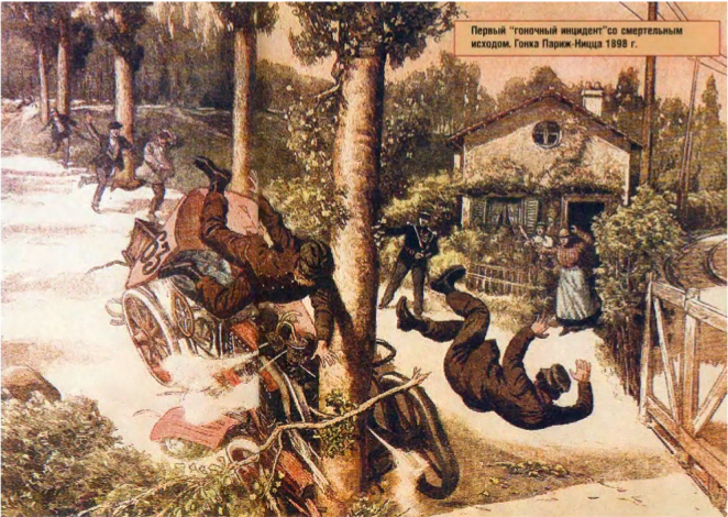 Кстати, через год после смерти Левассора - во время гонки Париж-Ницца произошла первая авария со смертельным для спортсменов исходом. Почти сразу же после старта гонщик де Монтариоль, шедший на Benz, проезжая мимо своего друга маркиза де Монтегнак, поднял руки в знак приветствия, оставив руль на какое-то мгновенье без контроля. В тот же миг машина слетела с трассы и, врезавшись, перевернулась. Монтариоль остался цел, а вот его механик, сидевший рядом, погиб. Но этим дело не ограничилось: де Монтегнак, обернувшийся посмотреть, что произошло, тоже не удержал свою машину на дороге, перевернулся и погиб...