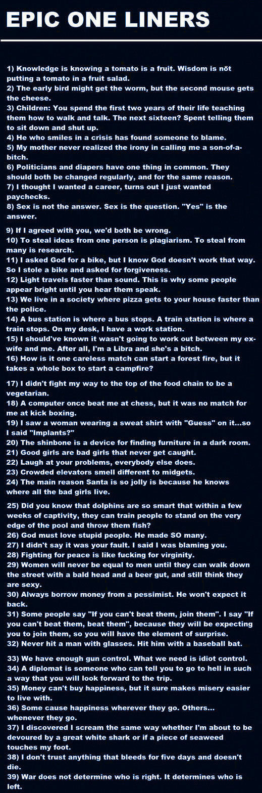 Awesome , Funny One Liners . Here are some of the funniest one liner jokes on the internet . Make sure to share them with all your family and friends: 41 . "There's a reason it's called 'girls gone wild' and not 'women gone wild' . When girls go wild, they show their tits . When women go wild, they kill men and drown their kids in a tub ."
