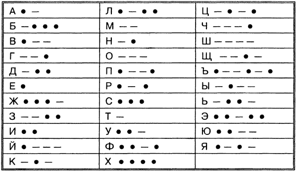 Сейчас повсеместно используется международный телеграфный код, который включает 26 букв латинского алфавита, 10 цифр, а также несколько знаков препинания и служебных символов . А как известно, в русском языке букв сильно больше, поэтому ниже мы представляем вашему . . .