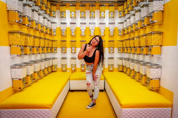 Piękna Azjatycka Modelka Pozuje Pokoju Pełnym Gum Żucia . . .