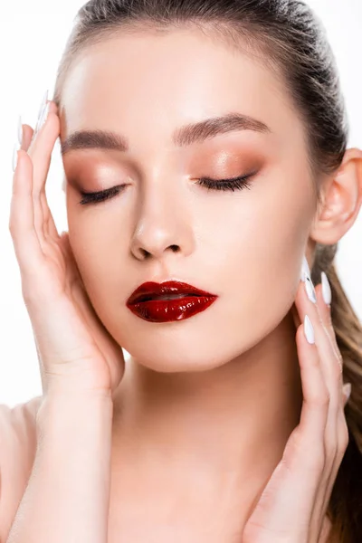 młoda azjatycka modelka pozowanie na żółtym tle . Beautiful asian woman face close up portrait young studio on gray . Young asian skin care woman happily touch her face and enjoy herself . kosmetyczny do pielęgnacji skóry kobiety uśmiechają się do siebie odizolowane na bluebackground, asian .