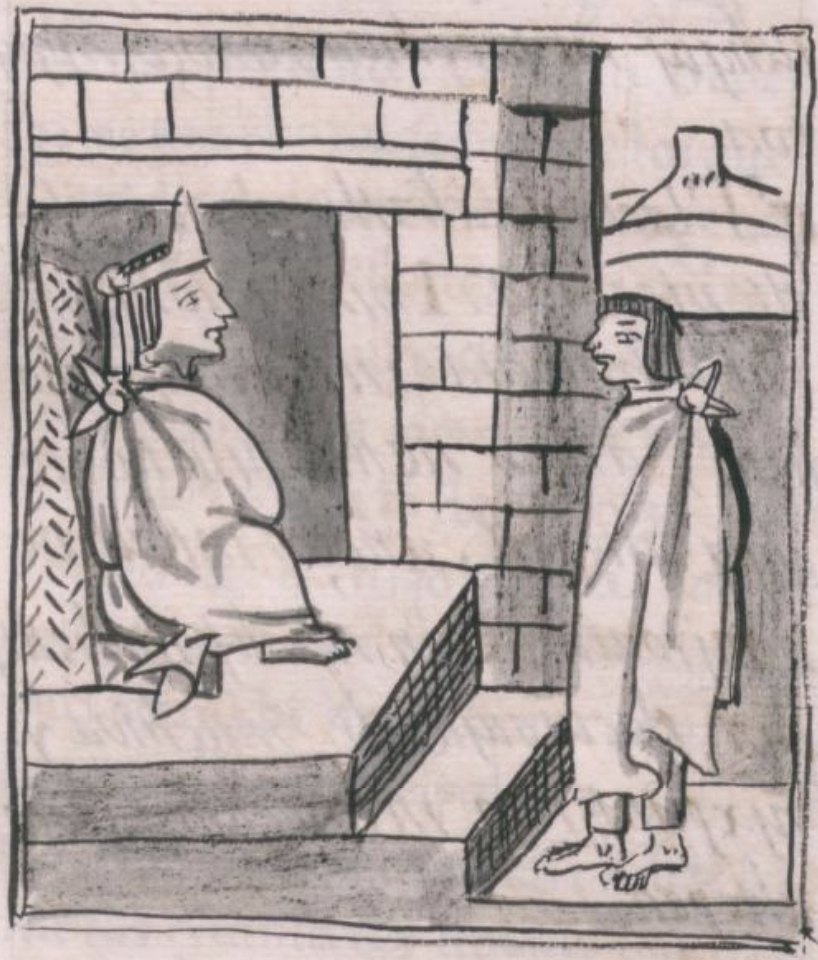 Но прежде всего тлатоани – это голос народа, дипломат. А уэй тлатоани вообще считался голосом Тескатлипоки и проводником его воли в этом мире, человеком божественного происхождения. В обществе уэй тлатоани все остальные находились исключительно в простых одеяниях, голова опущена, смотреть нельзя. Император передвигался в роскошном паланкине, а если всё-таки приходилось спешиться, то высокие лорды подметали перед ним путь и клали одежды на шаг ноги – чтобы не дай Тескатлипока ему соприкоснуться с землёй.