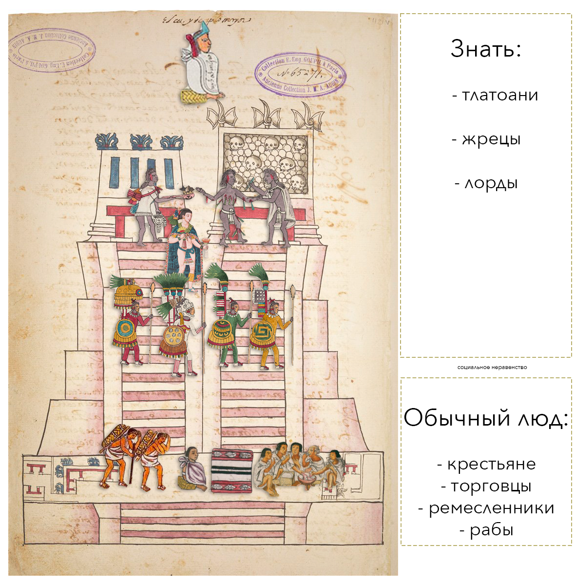 Ацтекское общество, как и, наверное, большинство обществ мира всех времён и народов, можно разделить на две группы классов: знать пипильтин (pipiltin, в ед.ч. – пилли, pilli) и простолюдины масеуалтин (macehualtin, ед.ч. – macehualli, масеуалли):