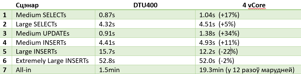 “Дзеля навукі” я прагнаў тэсты яшчэ на 6 vCore і 800 DTU (версіі 600 няма), якія паказалі амаль аднолькавыя вынікі, на 10-15% лепшыя за DTU 400. Без дэградацыі ў складаных сцэнарах - відавочна з-за большага аб'ёму памяці.