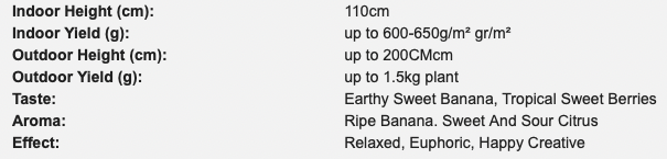 BANANA PUNCH™ — це сильна міцна рослина, надзвичайно універсальна для широкого діапазону технологій вирощування, у приміщенні досягає ідеально керованої висоти протягом кількох тижнів, тоді як на відкритому повітрі ви можете очікувати чогось дуже особливого, що досягне зрілості наприкінці вересня.