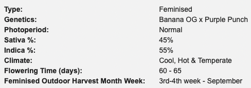 BANANA PUNCH™ — це ще один майстер-клас із селекції від лабораторії Barney’s Farm і наступне чудове доповнення до нашої престижної виняткової колекції квітів, що поєднує два найпопулярніші генетики Banana OG та Purple Punch!