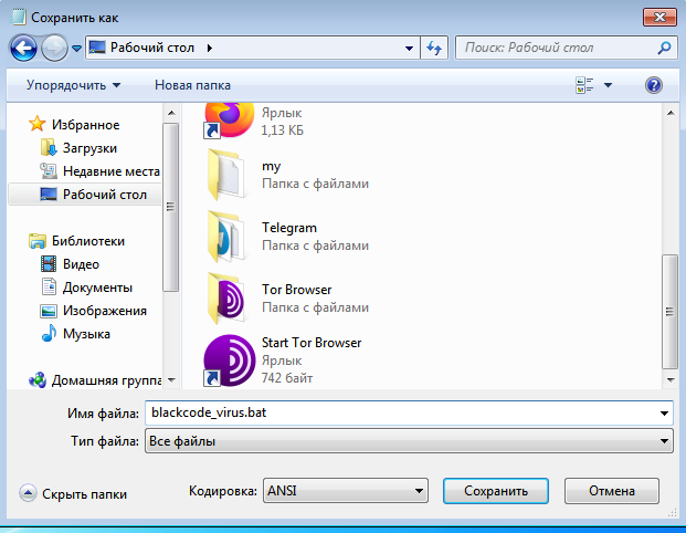 - Сохранить файл с расширением .bat(Пример: blackcode_virus.bat)